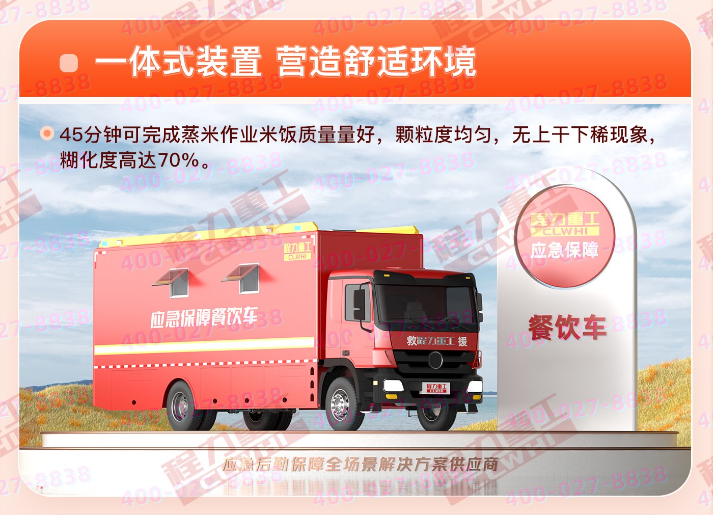 重汽汕德卡飲食保障車集爐、櫥、箱、案與一體,緊湊靈巧;實現了衛生、健康、環保的要求; 功能性等集合為一體。車廂可兩邊展開作為打餐窗口;車廂內飾為不銹鋼,配備不銹鋼爬梯、護欄、凈水箱,污水箱,雙眼灶,蒸飯車,冰箱等。不銹鋼整體壁柜,工作臺,發電機,空調等。該車機動性能好,專業性強,自動化程度高,自然環境適應性強,并能在駐車和行車時進行炊事作業,可保障執行野外任務部隊的飲食和飲水供應。